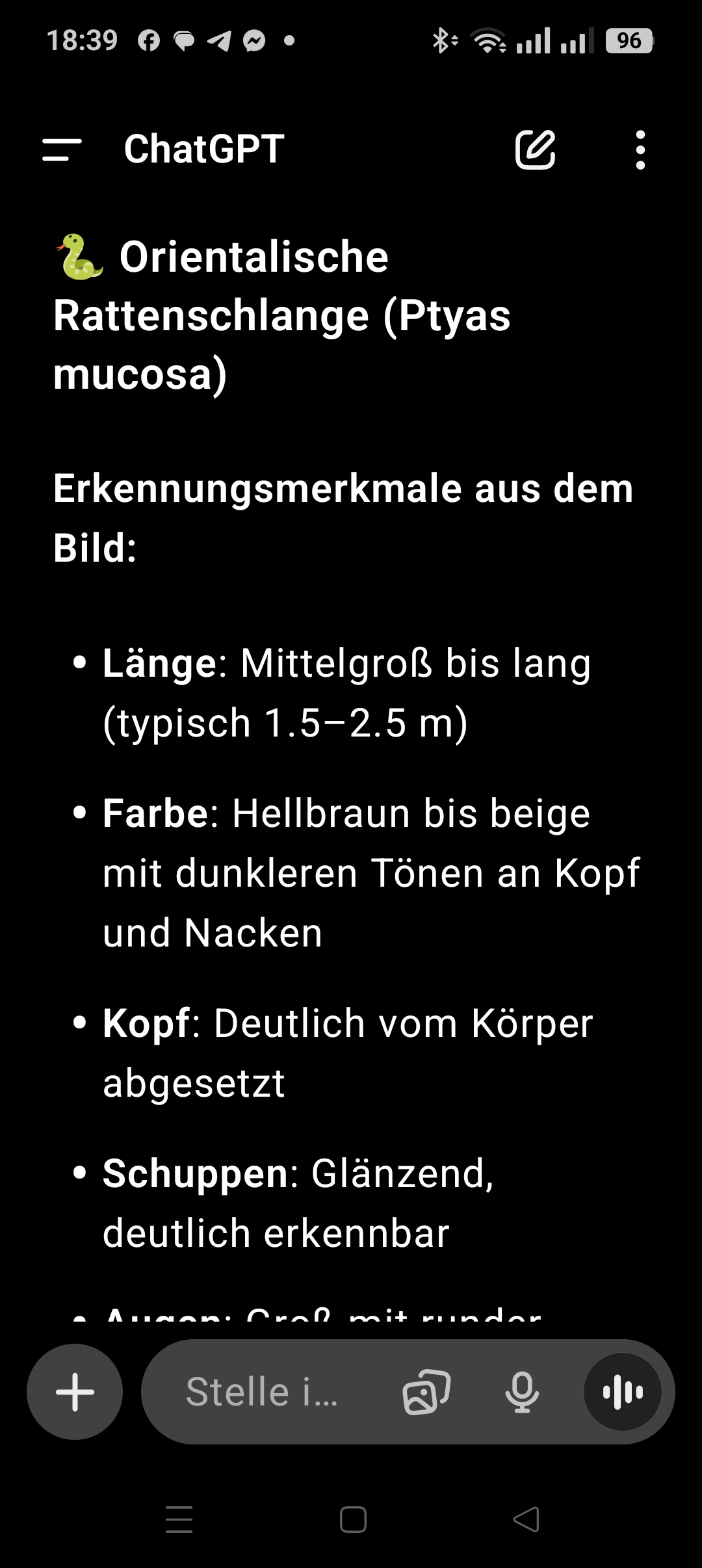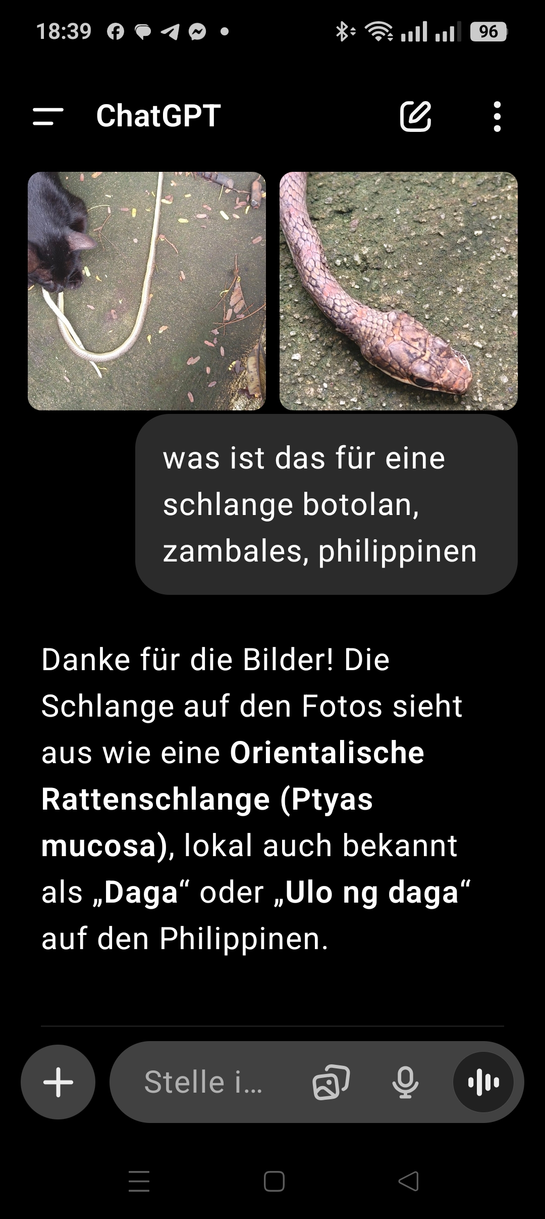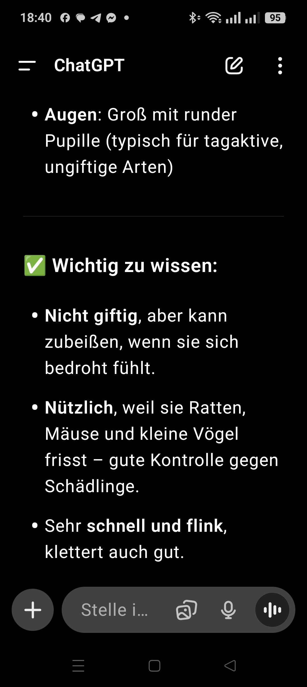 17.07.2025 die erste schlange auf meinem grundstück, die ich gesehen habe, aber tod juvy (meine katze) hat sie erlegt. gemäss chatgpt war es eine rattenschlange. nicht giftig und nützlich weil sie ratten und mäuse frisst, wie erkläre ich das juvy 🙂 🙂 🙂
