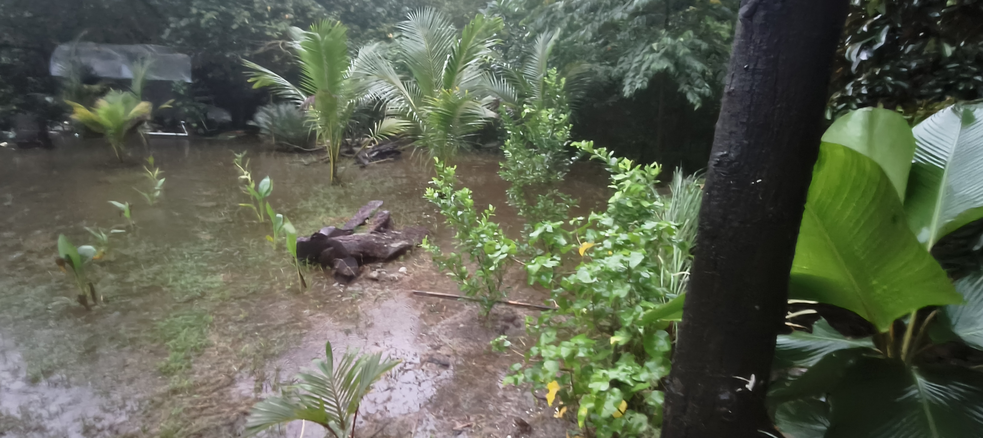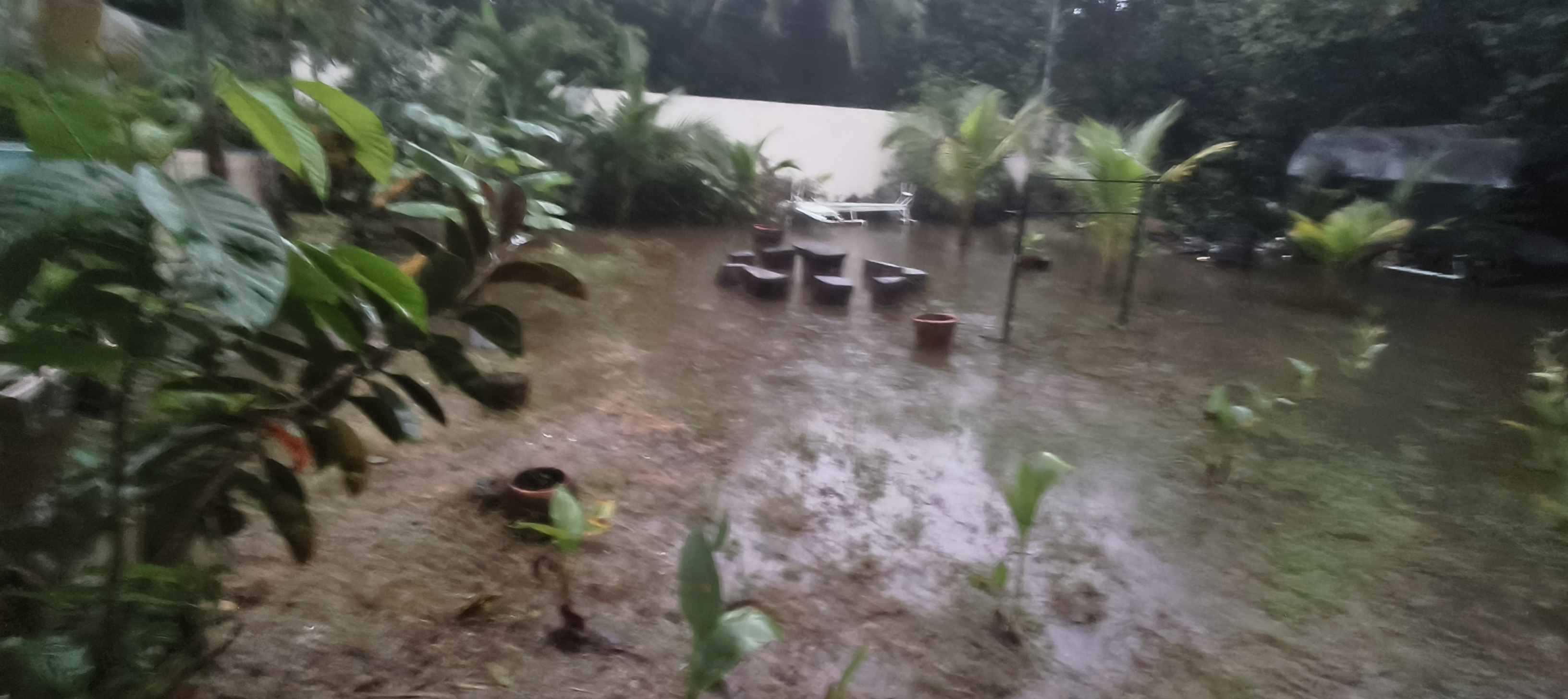 22.07.2025 der regen hört nicht auf, seit 7 tagen orange rainfall warning ( das ist die 2. höchste stufe) auch auf meinem grundstück sieht man das. das wasser kommt allerdings vom bach hinter dem haus, in der grundstücks mauer hat es etwa 10 löcher, ein wenig höher als bodenhöhe, da sollte eigentlich das wasser ablaufen vom grundstück her. leider ist das gegenteil der fall und das wasser vom bach kommt da rein, so ist der unterste teil des landes manchmal ein wenig geflutet.