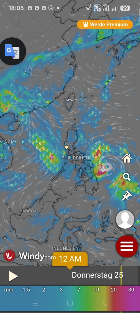 25.09.2025 ein schöner sonniger tag aber der nächste thypon kommt am weekend und er zieht über das land und manila, leider schächte er sich nicht so sehr ab wie ich gehofft hatte, es stürmt ziehmlich da unten weiter im süden 😦 😦 😦 hoffen wir das beste für die leute die da wohnen und am sonntag sollte es dann wieder besser sein. 🙂 🙂 🙂 bei uns ist heute 26.09.2025 nur leichter wind und wenig regen.
